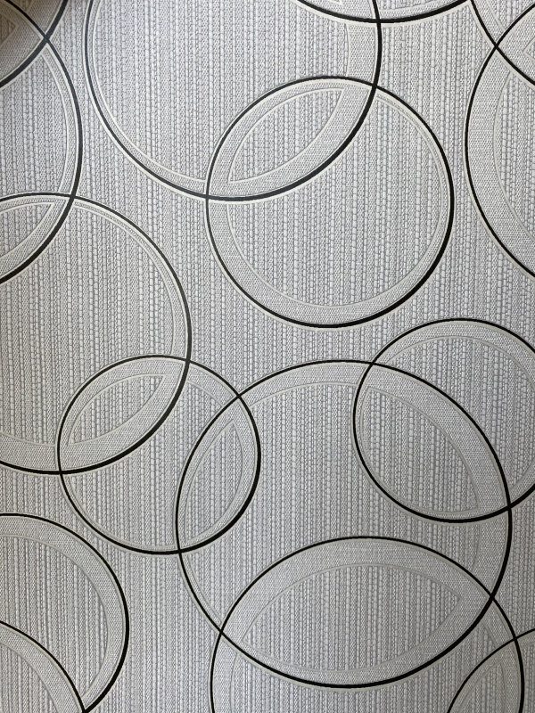 Szürke alapon fekete kör mintás vlies tapéta.